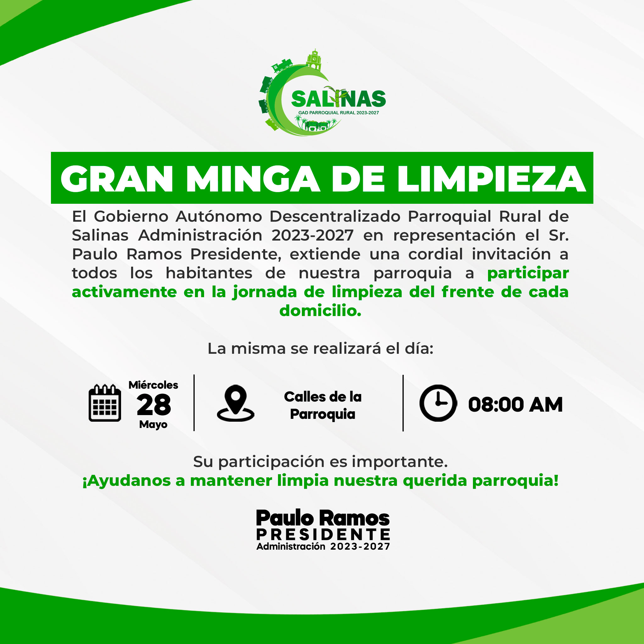 🌱 El GAD Parroquial Rural de Salinas, bajo la administración del Sr. Paulo Ramos, invita a todos los habitantes a participar activamente en la Gran Minga de Limpieza. 🌿