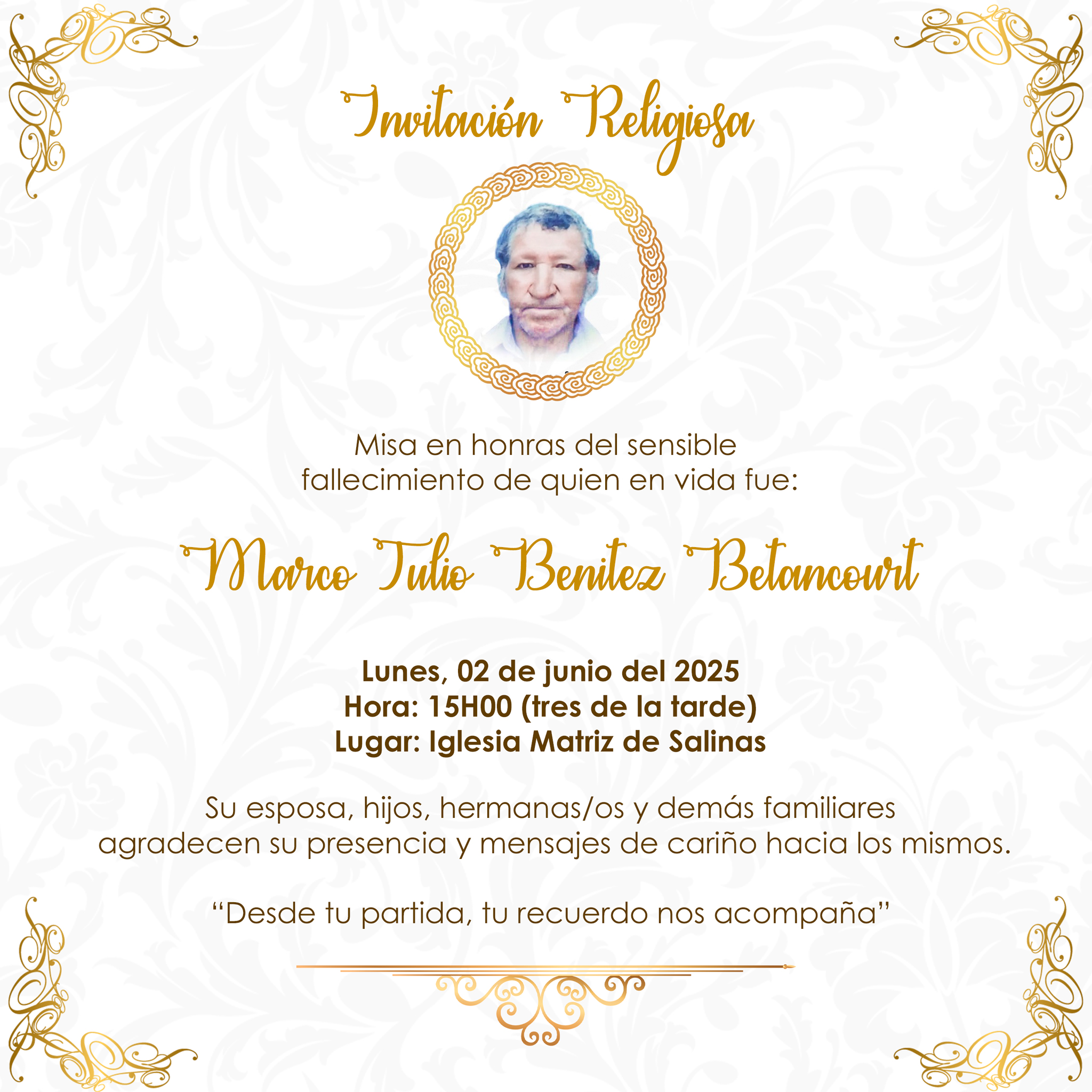 Misa en honras del sensible fallecimiento de quien en vida fue Marco Tulio Benitez Betancourt